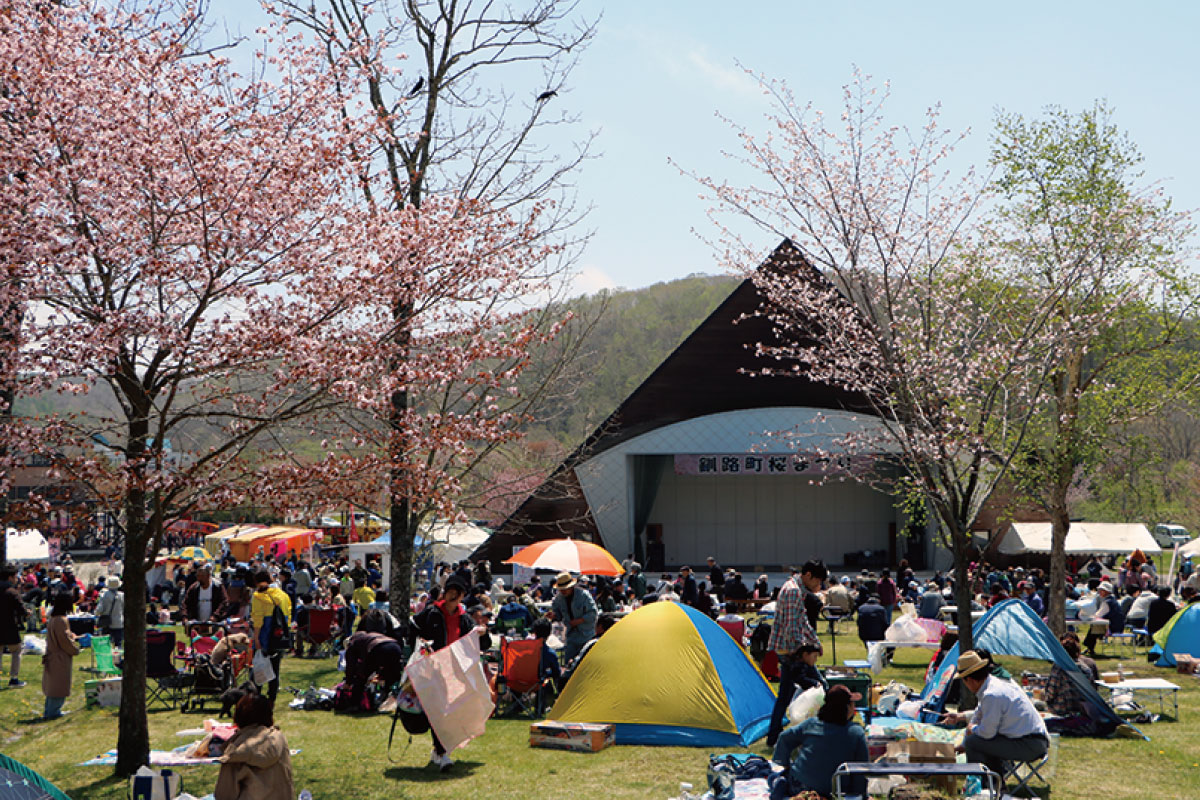 釧路町の桜の名所「別保公園」。日本一遅い桜(5月下旬)と有名です。毎年5月に行われる桜まつりでは、郷土芸能などの催し物を楽しみながら、花見を満喫しています。